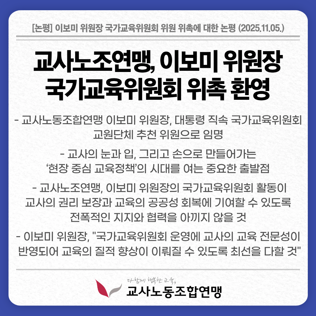 이보미 위원장 국가교육위원회 위원 위촉에 대한 논평 (2025-11-05)